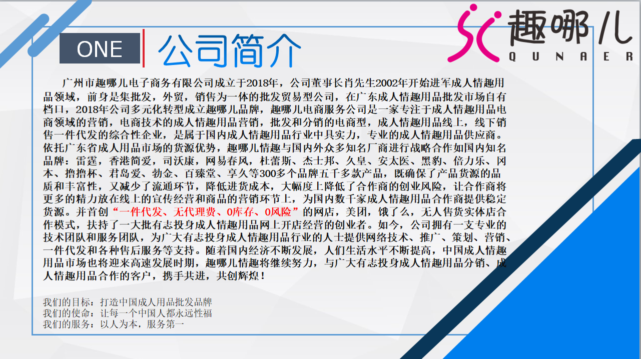 目前趣哪儿有5000多款产品,产品类目齐全且丰富多样,代理加盟方式更是多种可选:拼多多,淘宝,美团,饿了么,同城配送,一件代发,24小时无人售货店,实体店,1688小程序等等。我们是专业做成人用品,有专业的运营和技术团队,更有长达5年经验左右的选址督导,如果你也想了解更多关于成人用品,欢迎来咨询!