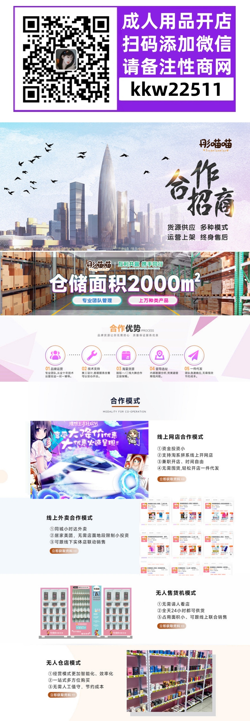 【彤喵喵】情趣成人用品开店,诚邀情趣用品及成人用品代理商加盟,提供多样化的丰富货源选择,支持一人开N店:小程序、淘宝、拼多多、京东、24小时无人售货店、自动售货机、美团饿了么外卖、云仓自助超市、实体娃娃馆线上线下都可做,将消费者一网打尽。