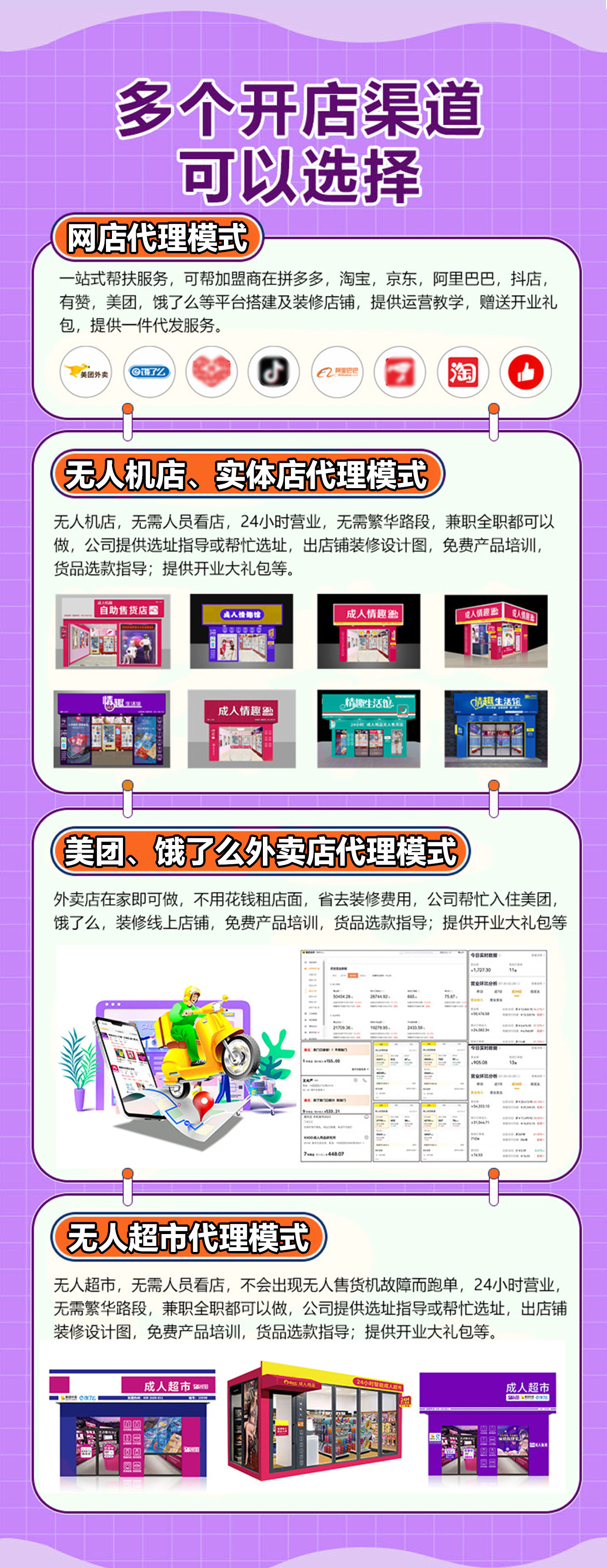 【爱佳兔】情趣成人用品开店,诚邀情趣用品及成人用品代理商加盟,提供多样化的丰富货源选择,支持一人开N店:小程序、淘宝、拼多多、京东、24小时无人售货店、自动售货机、美团、饿了么、京东秒送、抖音小时达等外卖、云仓自助超市、实体娃娃馆线上线下都可做,将消费者一网打尽。