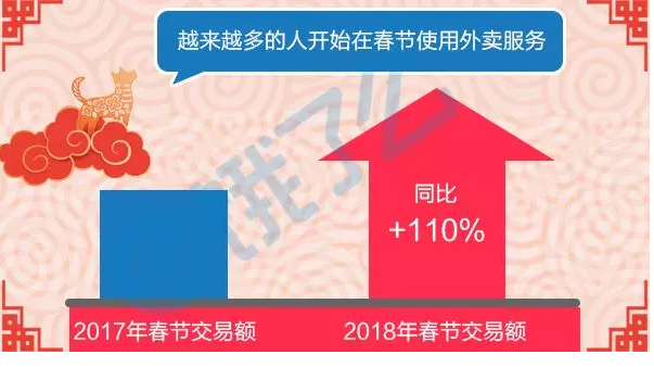 春节还会有人点外卖么?这个问题如果说几年前还觉得还新鲜,如今叫份外卖可以说是十分常见的过年形式了。饿了么大数据显示,2018年春节订单量与2017年春节相比增长100%,交易额同比增长110%。
