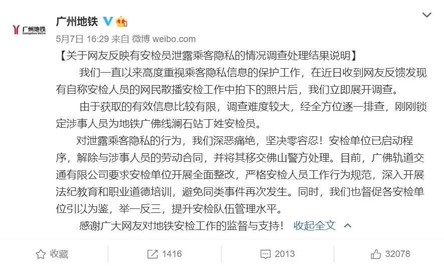 广州地铁昨(7日)在微博发文表示已经展开调查,确定泄露者为广佛线澜石站的1名安检员,已与其解聘并移送警方处理,强调“对外泄乘客隐私的行为,我们深恶痛绝,坚决零容忍!”但乘客人心惶惶,恐怕一时难以平复。