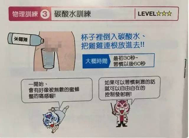 具体一点就是将丁丁泡在装有碳酸水的杯子里,让丁丁适应碳酸水的刺激,从而降低敏感度,达到延长时间的目的。