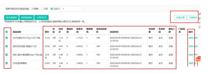 1.商品选择完,会出现在下方的列表中,设置促销可以点击右上角的批量设置或者**右侧的设置,设置单品