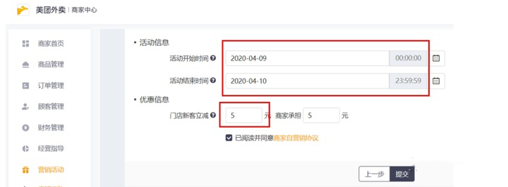 点击营销活动-店铺活动-新客立减,选择门店后设置开始和结束时间,输入新客立减的金额,后面商家承担金额为系统自动算出,确认无误后点击提交即可。