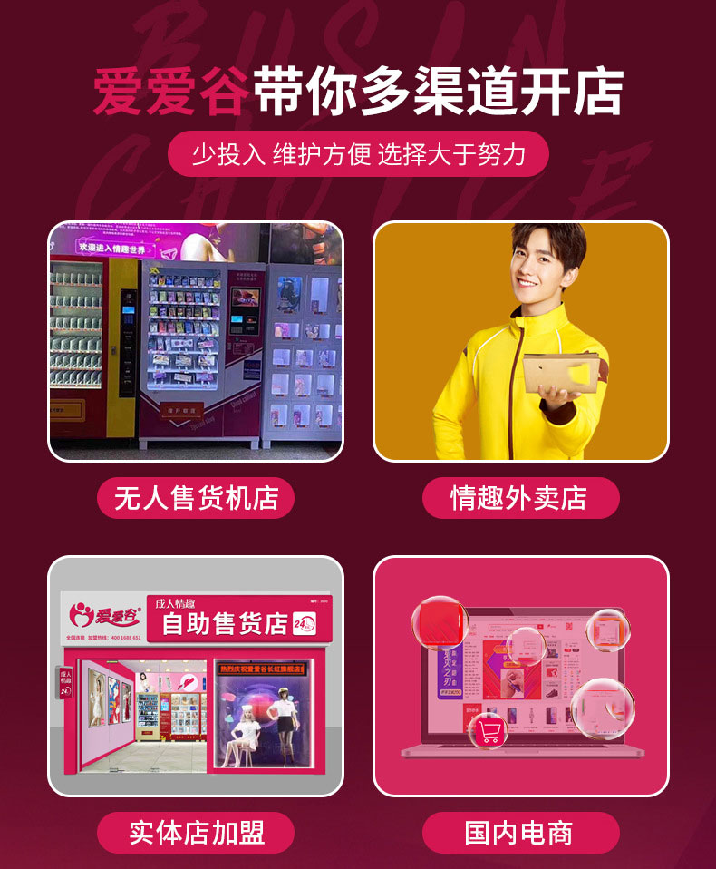 目前爱爱谷的合作模式包括:微商、有赞、淘宝天猫、独立商城、拼多多、京东、美团外卖,饿了么,实体店、无人售货机多种渠道经营。授予代理商开网店、实体店资质证件,省去很多麻烦。