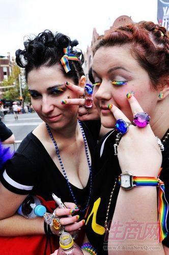 游行的人们恨不得把身上所有能弄成彩虹色的地方都弄成这个颜色,从睫毛到指甲,再到配饰和衣服。