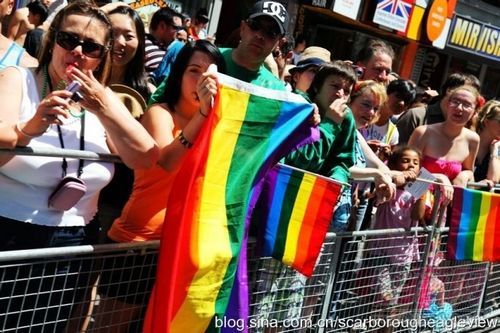 看过以前的报道,游行的人数接近百万,如今亲眼看到十分震撼。市民们几乎倾巢出动,拥挤于市中心的Church、Bloor、Yonge、Gerrard大街。到处都是人,到处都是无边无际的喧嚣声,让你无处可逃。这不仅仅是同性恋者的节日,也是整个城市的节日。