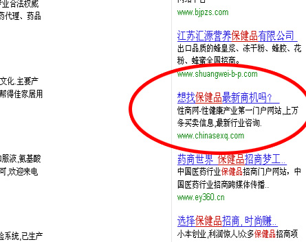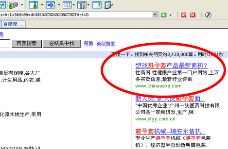 继重金抢得阿里巴巴网络实名的王牌位置后,今天,manbetx官网手机登陆再次花重金购买了百度的竞价排名第一的位置。manbetx官网手机登陆购买的是“安全套”、“避孕套”、“保健品”、“一夜情”这四个关键词。